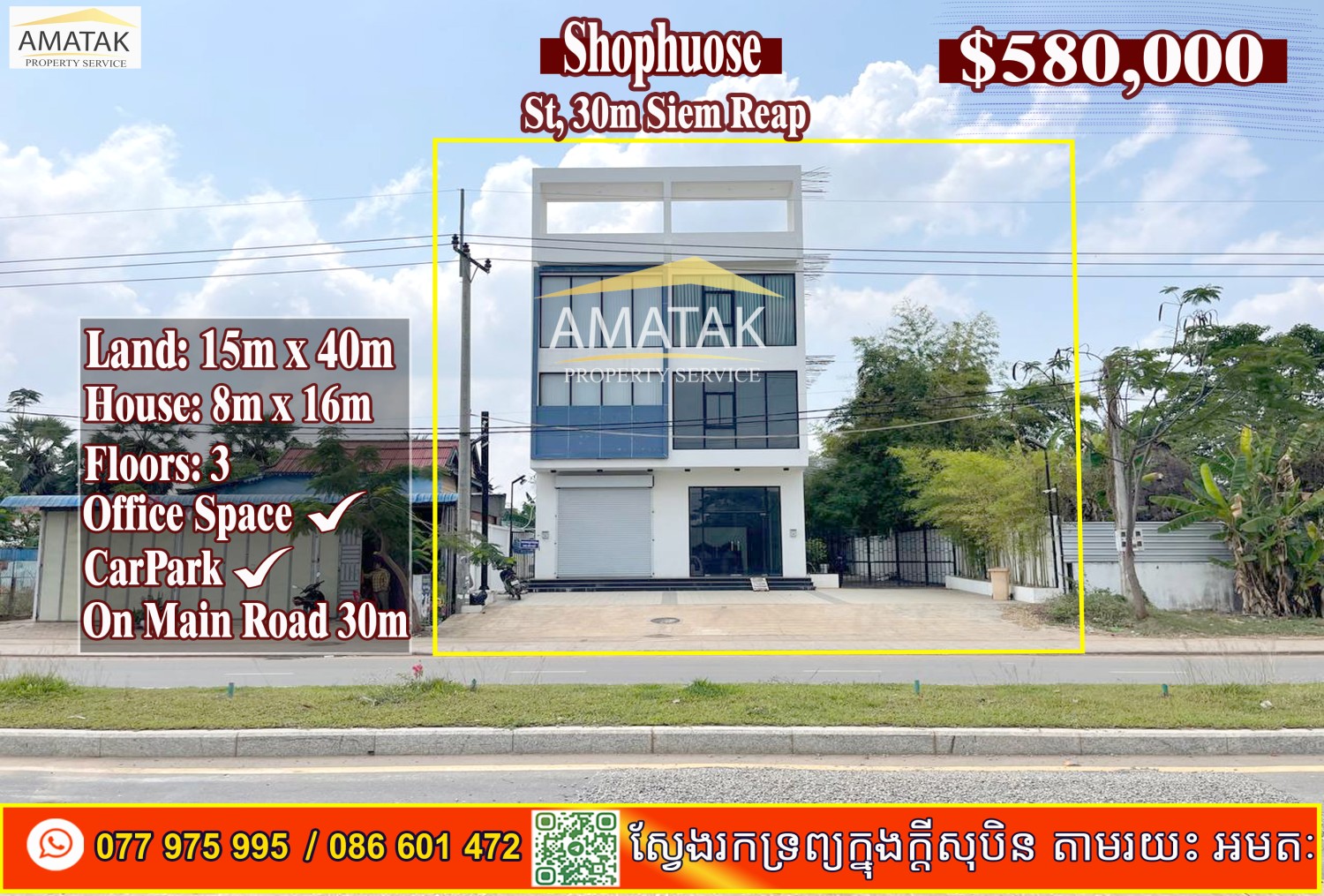 ផ្ទះអាជីវកម្ម 3 ជាន់ នេះ ស្ថិតនៅលើផ្លូវធំ 30m ក្នុងក្រុងសៀមរាប ដែលជាទីតាំងល្អសម្រាប់អាជីវកម្មផ្សេងៗ។ មានទំហំដី 15m x 40m និងទំហំផ្ទះ 8m x 16m ល្អសម្រាប់ប្រកបអាជីវកម្ម។